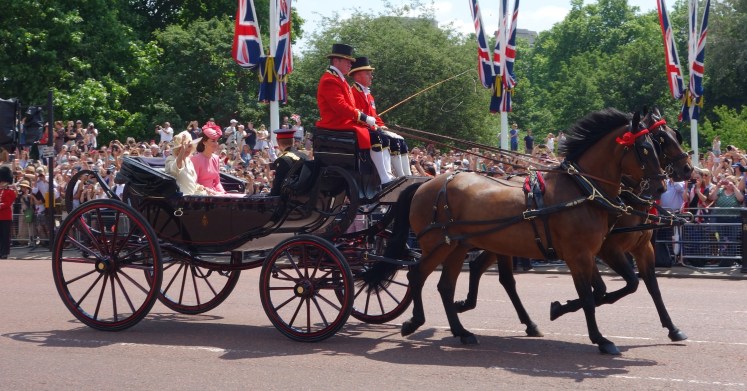 Trooping the colour is an inspection of the Queen’s guards by the queen. The inspection takes place at horse guard parade followed by a procession to buckingham palace, where the royal family is watching an aur force flight over.