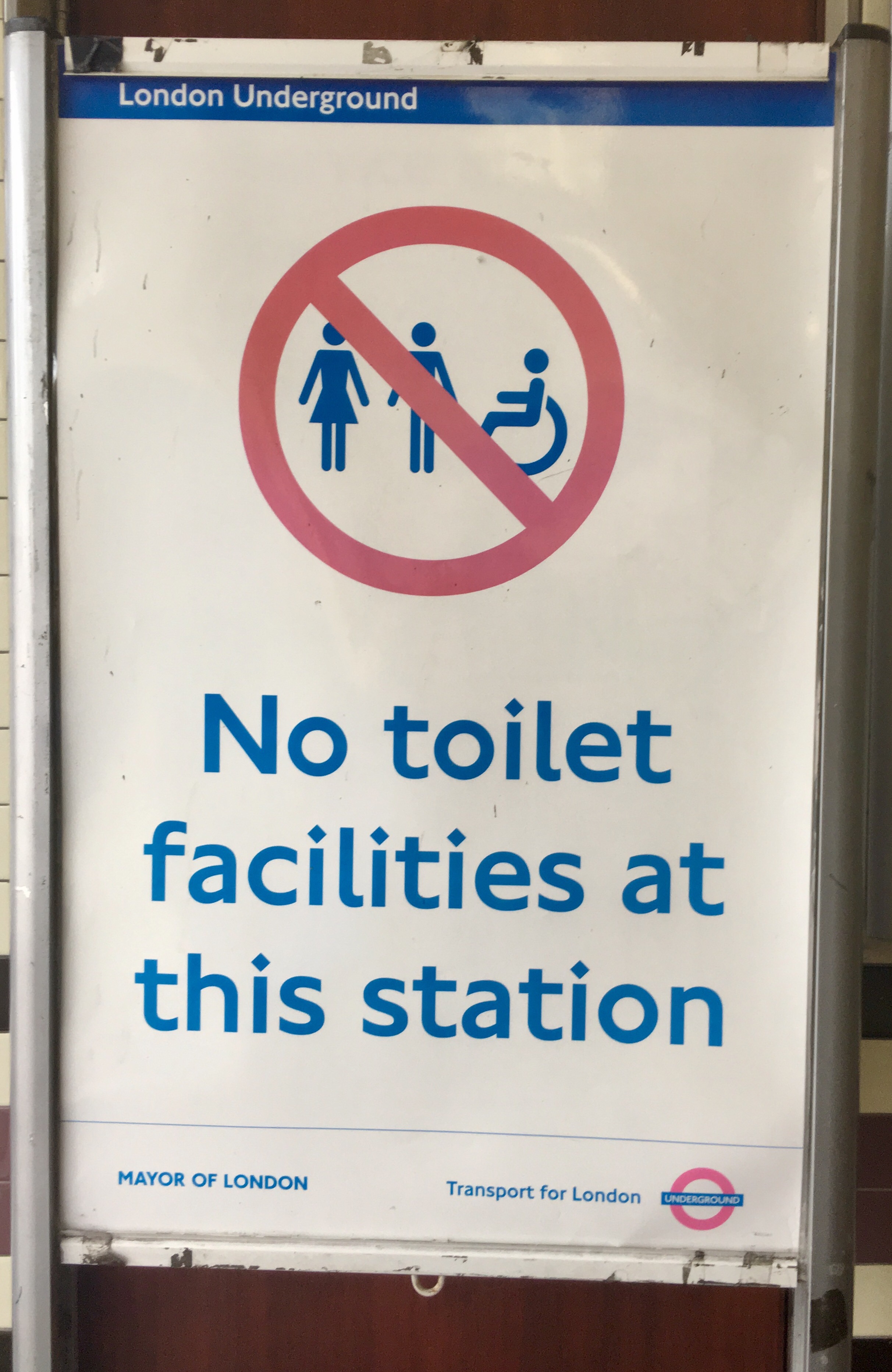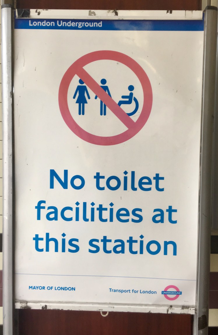 The next one is a ery useful sign positioned at the station entrance. However, I have never noticed a toilet on any tube station I’ve been so far, independently of whether there was a sign or not at the station entrance. So I am not sure how valuable this sign might be. And I doubt that someone enters the Tube station paying the fare just to go to the toilets.