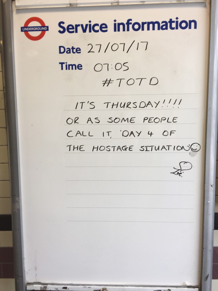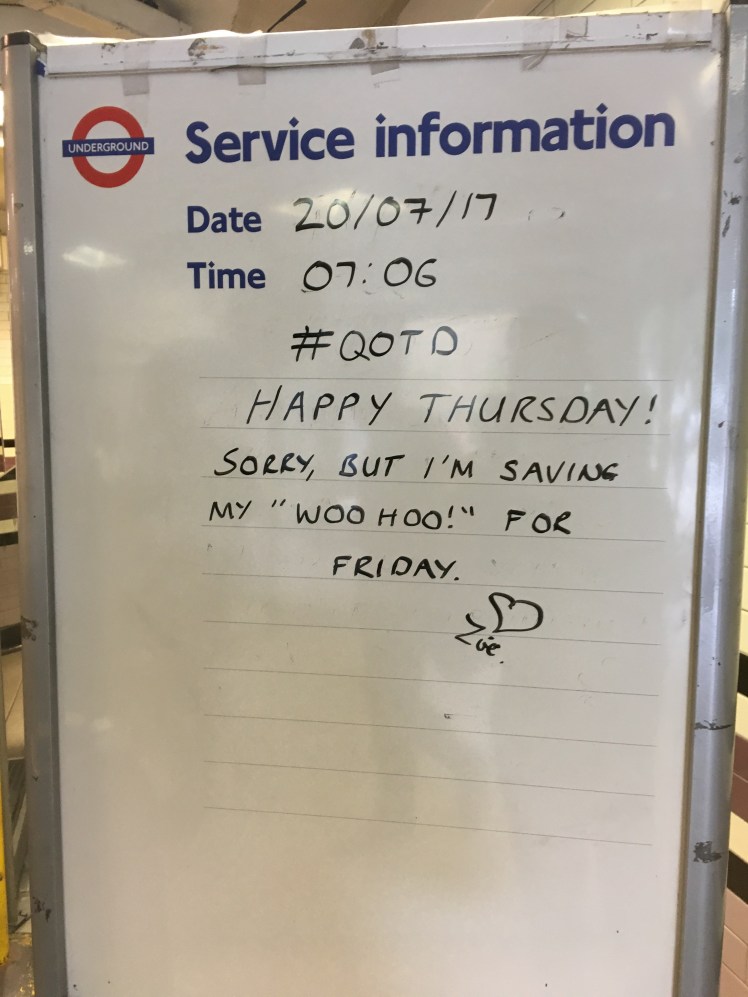 Apart from the official signs to make customers aware of rules and major risks, there are boards which tube employees use to greet their customers. These are the ones I really like. It makes a smile on your face and gives you a nice start in the day before getting to the office. It is also a perfect example of British humor.